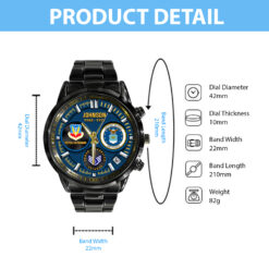 Make your Black Stainless Steel Watch uniquely yours by adding your custom information such as name, rank, and years of service. This personalized detail adds a special touch, celebrating your military journey with elegance and grace.