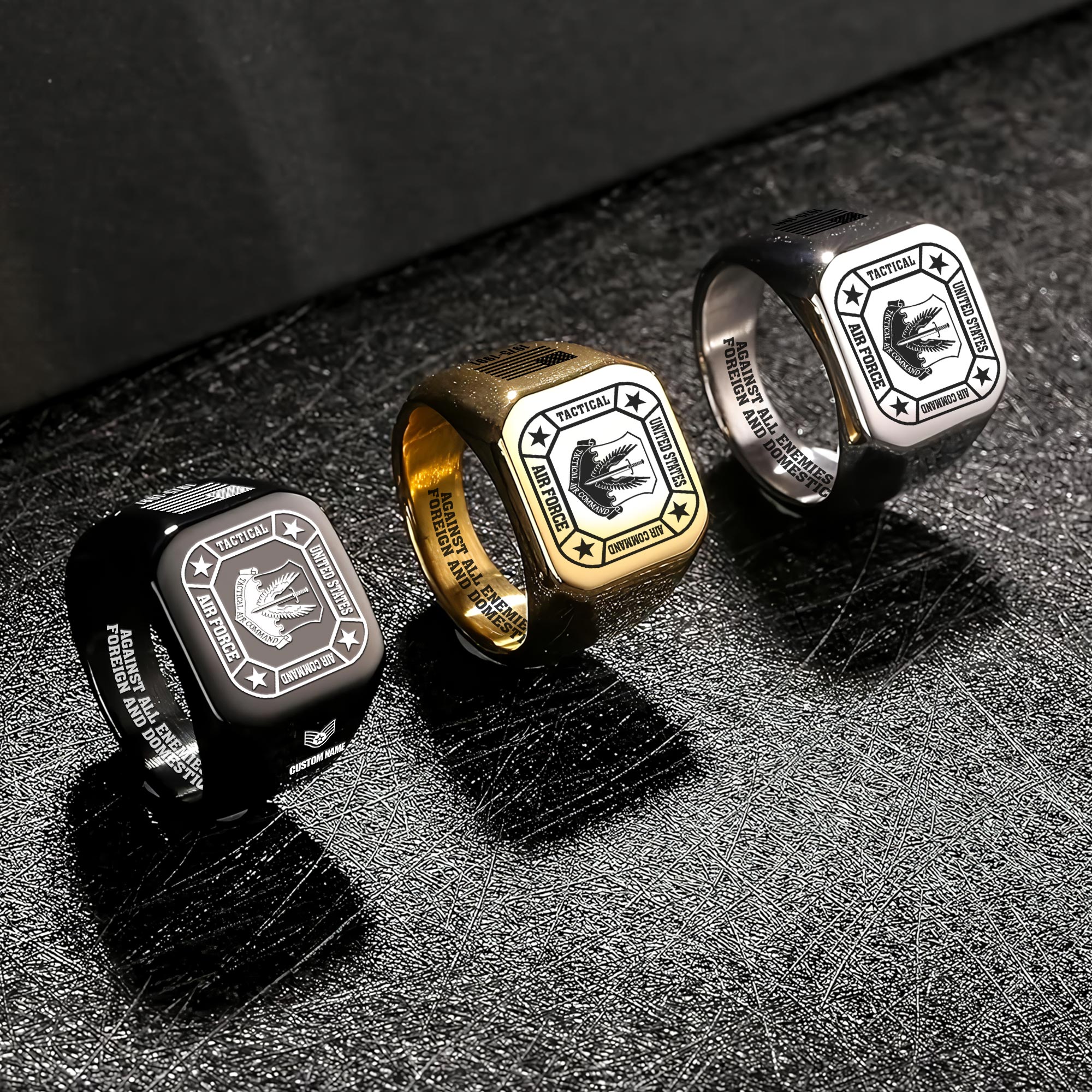 Choose from three sophisticated color variations – Silver, Gold, and Black – designed to complement any wardrobe. These rings stand as more than accessories, embodying the proud tradition of military service and sacrifice.