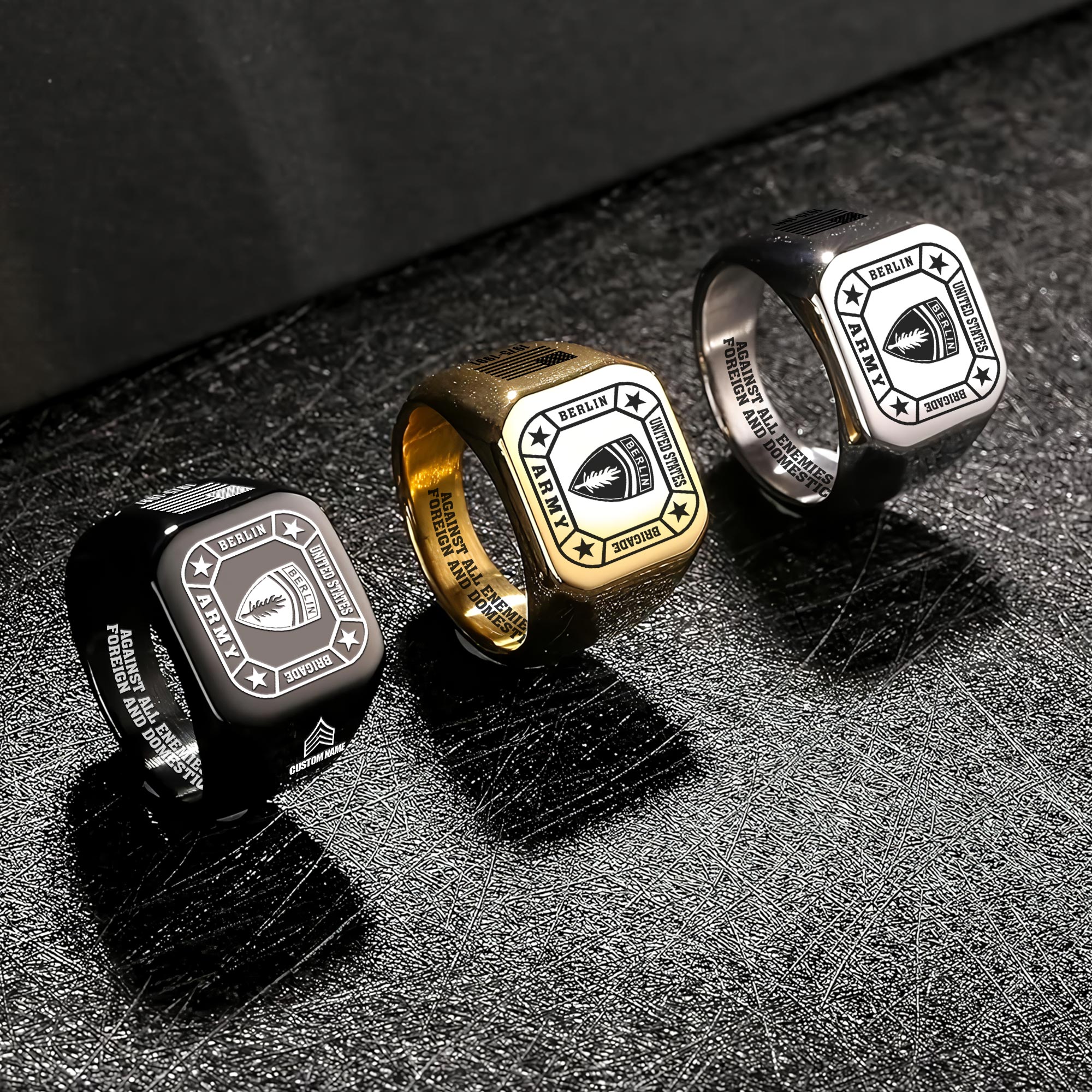 Presented in three elegant finishes – Silver, Gold, and Black – each offering distinct character and appeal. Beyond simple ornamentation, these rings honor military tradition, representing courage and commitment to service.