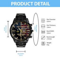 Personalize your Black Stainless Steel Watch with custom engravings of your name, rank, and years of service. This thoughtful addition transforms your watch into a cherished memento, honoring your dedication and commitment to service.