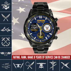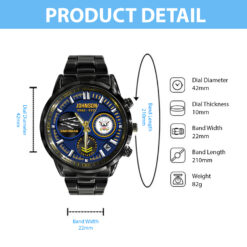 Make your Black Stainless Steel Watch a reflection of your personal journey by including custom details like your name, rank, and years of service. This personalized feature not only adds a touch of elegance but also serves as a timeless tribute to your dedicated service to our country.