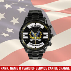 Elevate your Black Stainless Steel Watch with a personal touch by incorporating your custom details like name, rank, and years of service. This unique addition commemorates your military experience in a stylish and meaningful way.