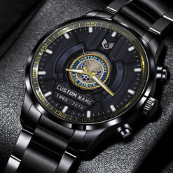 Personalize your Black Stainless Steel Watch with custom engravings of your name, rank, and years of service. This thoughtful addition transforms your watch into a cherished memento, honoring your dedication and commitment to service.