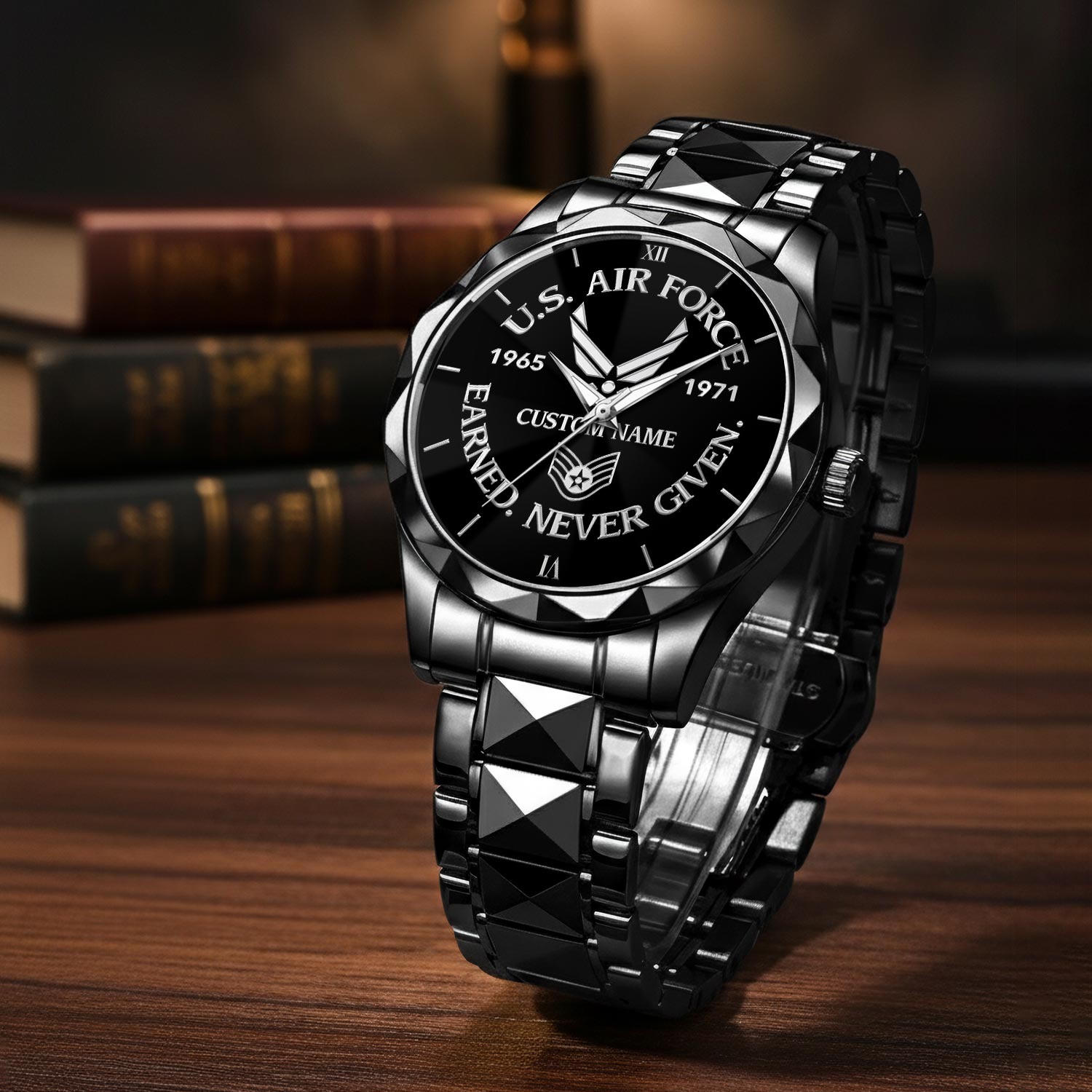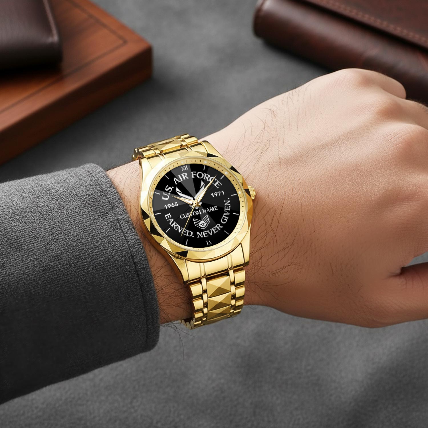 Customize your Diamond-Cut Bezel Watch with your name, rank, and years of service for a truly one-of-a-kind timepiece. This personalized feature allows you to showcase your military journey with pride and distinction.