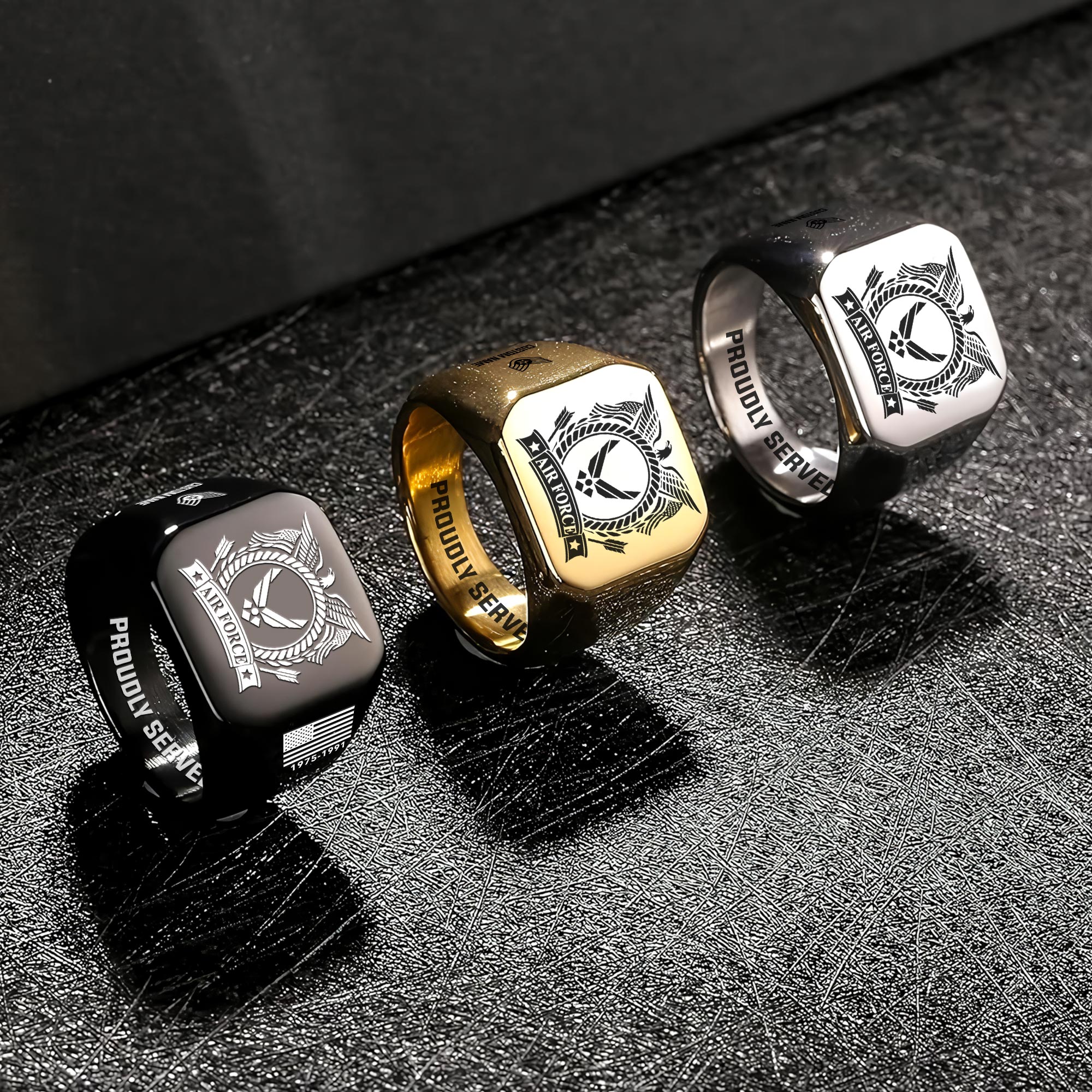 Features three refined finish options – Silver, Gold, and Black – each capturing different aspects of personal style. These rings represent far more than fashion statements, honoring the noble spirit of military dedication and service.