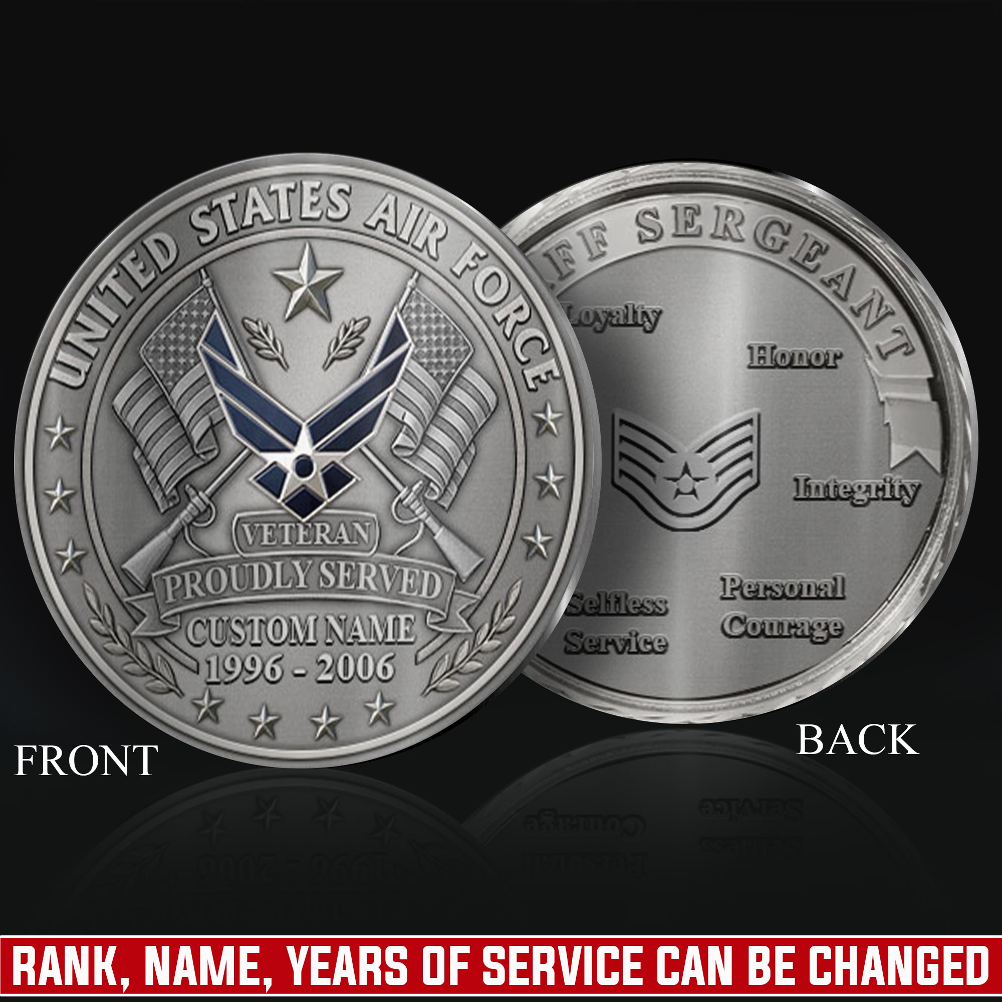 Honor Their Service: customize with veteran’s name, achieved rank, service branch, assigned unit, career specialty, or total years served on both coin faces.