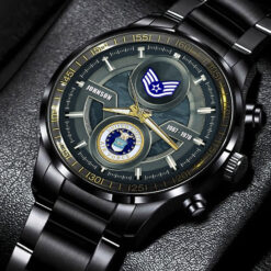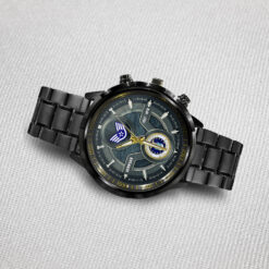 Personalize your Black Stainless Steel Watch with custom engravings of your name, rank, and years of service. This thoughtful addition transforms your watch into a cherished memento, honoring your dedication and commitment to service.