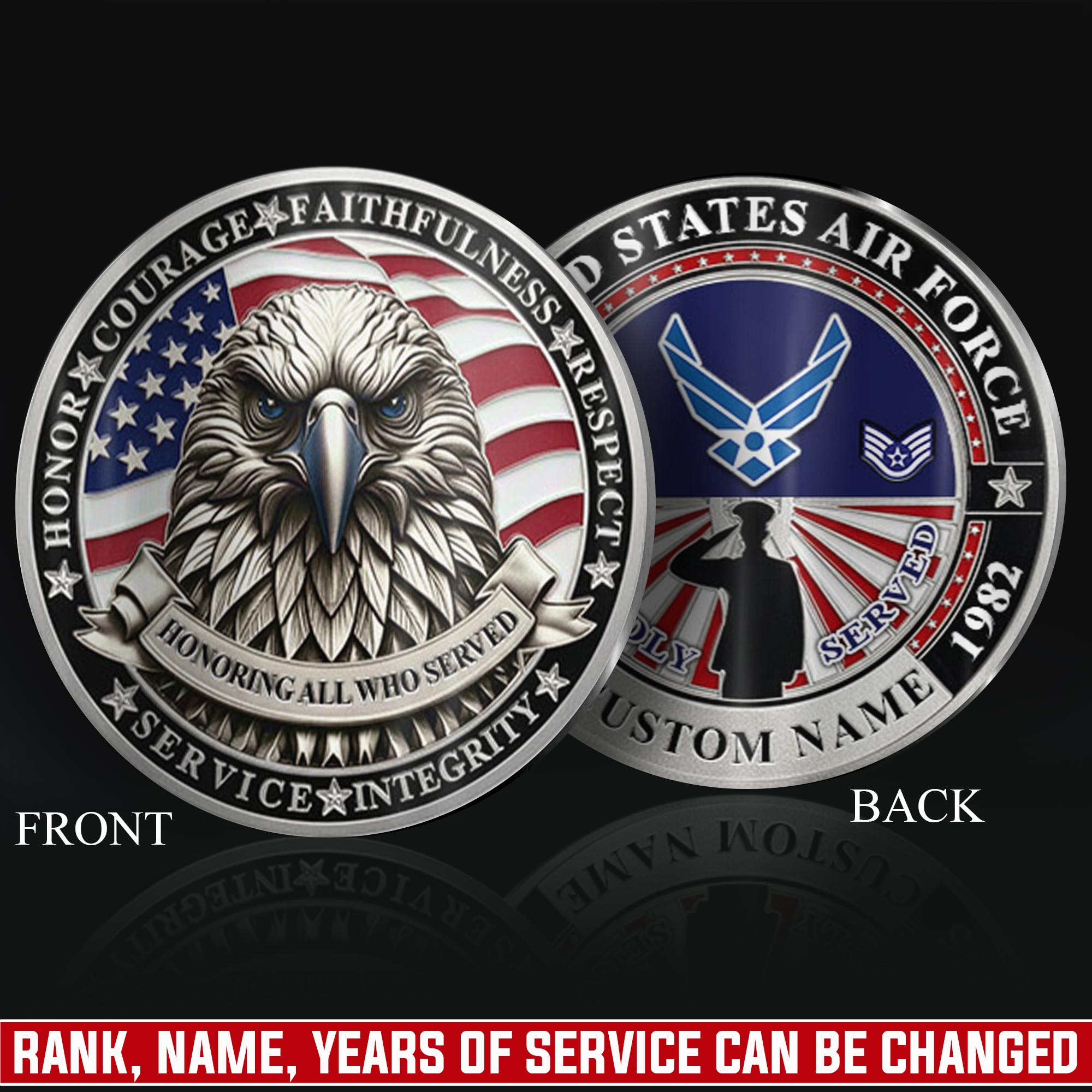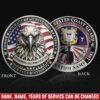 Honor Their Service: customize with veteran’s name, achieved rank, service branch, assigned unit, career specialty, or total years served on both coin faces.