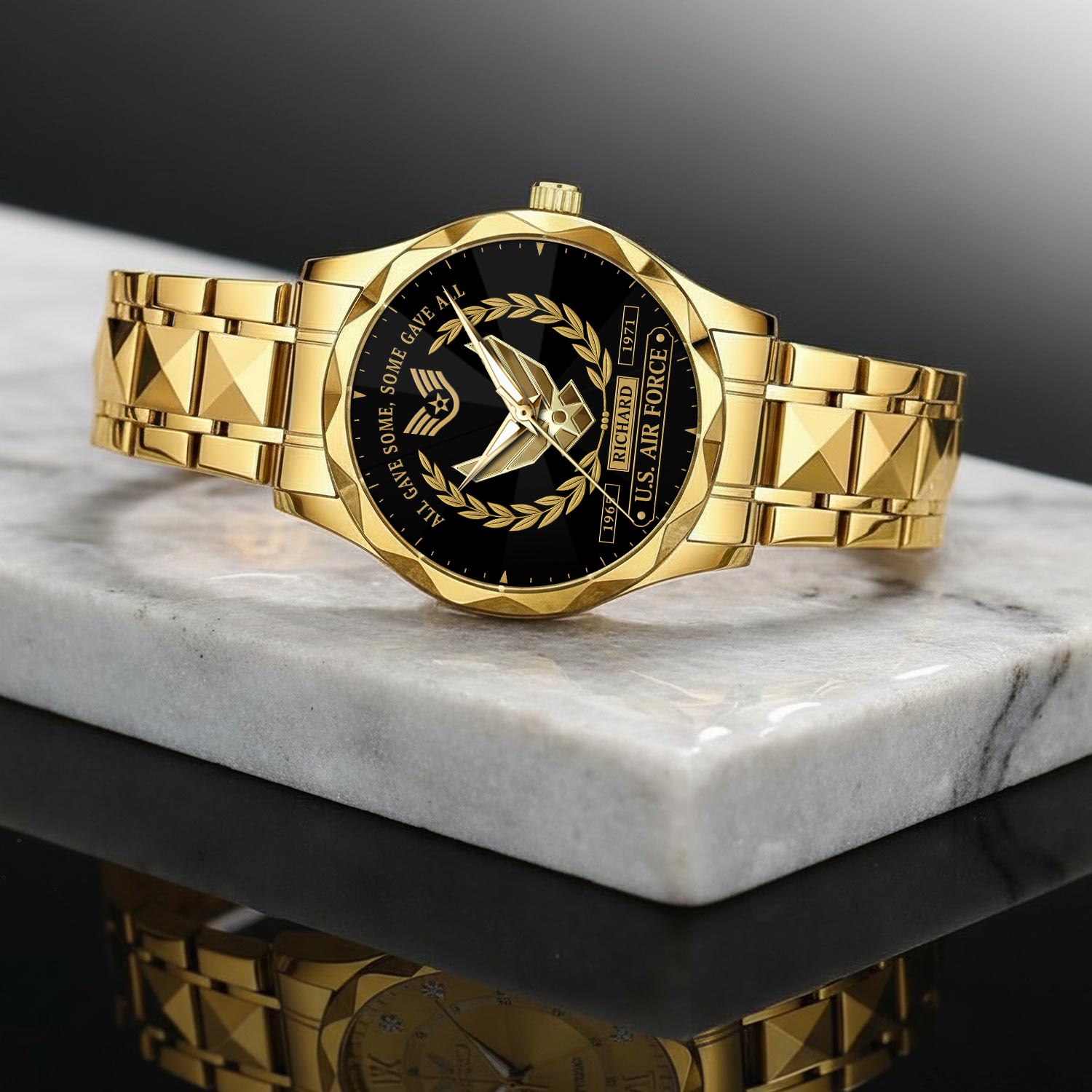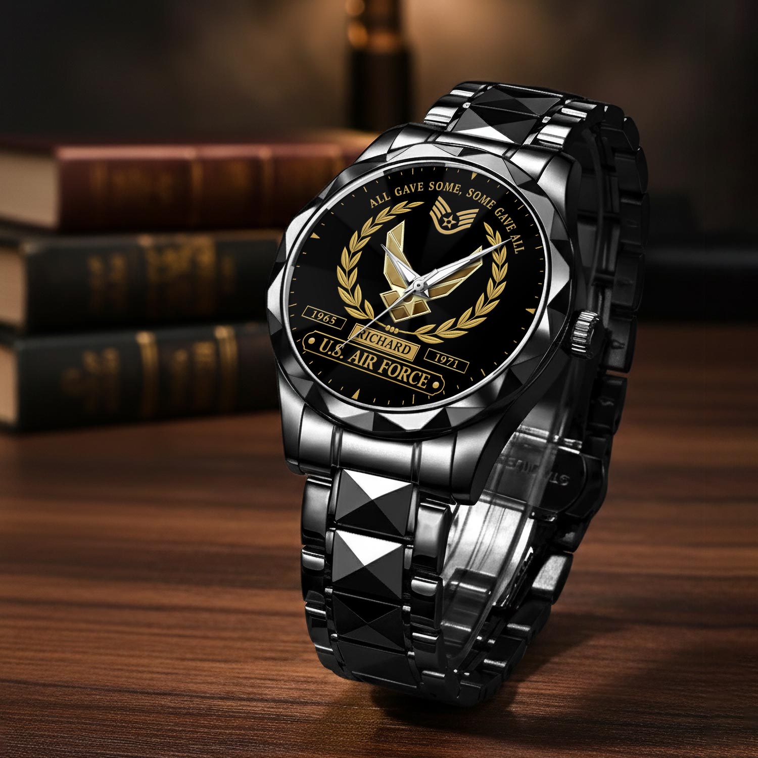 Make your Diamond-Cut Bezel Watch a reflection of your personal journey by including custom details like your name, rank, and years of service. This personalized feature not only adds a touch of elegance but also serves as a timeless tribute to your dedicated service to our country.