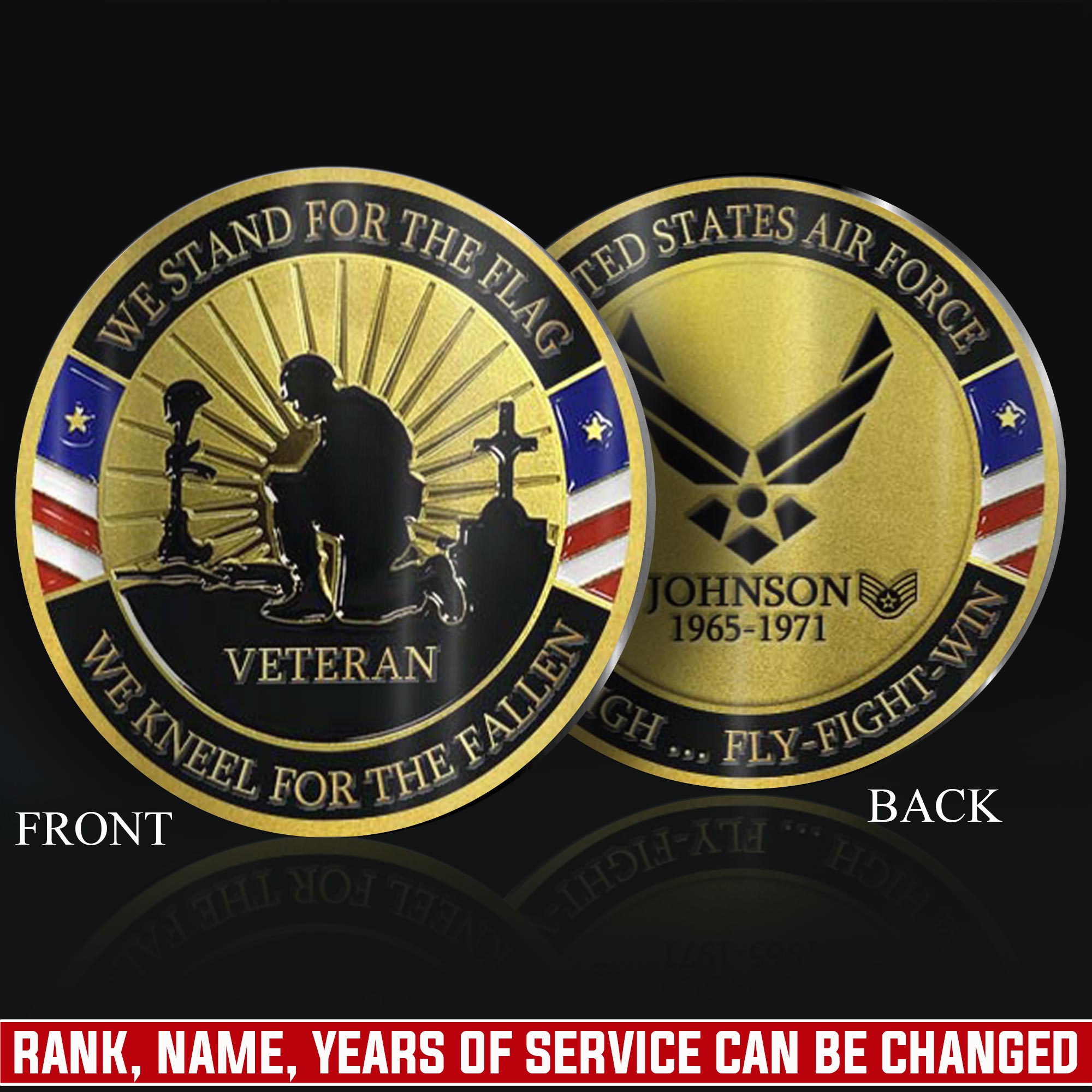 Create Your Legacy: personalize both sides with service member’s name, military rank, branch insignia, unit identification, occupational specialty, or service period dates.