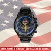 Customize your Black Stainless Steel Watch with your name, rank, and years of service for a truly one-of-a-kind timepiece. This personalized feature allows you to showcase your military journey with pride and distinction.