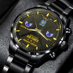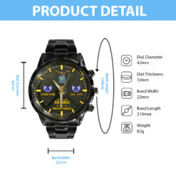Personalize your Black Stainless Steel Watch with custom engravings of your name, rank, and years of service. This thoughtful addition transforms your watch into a cherished memento, honoring your dedication and commitment to service.