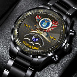 Personalize your Black Stainless Steel Watch with custom engravings of your name, rank, and years of service. This thoughtful addition transforms your watch into a cherished memento, honoring your dedication and commitment to service.