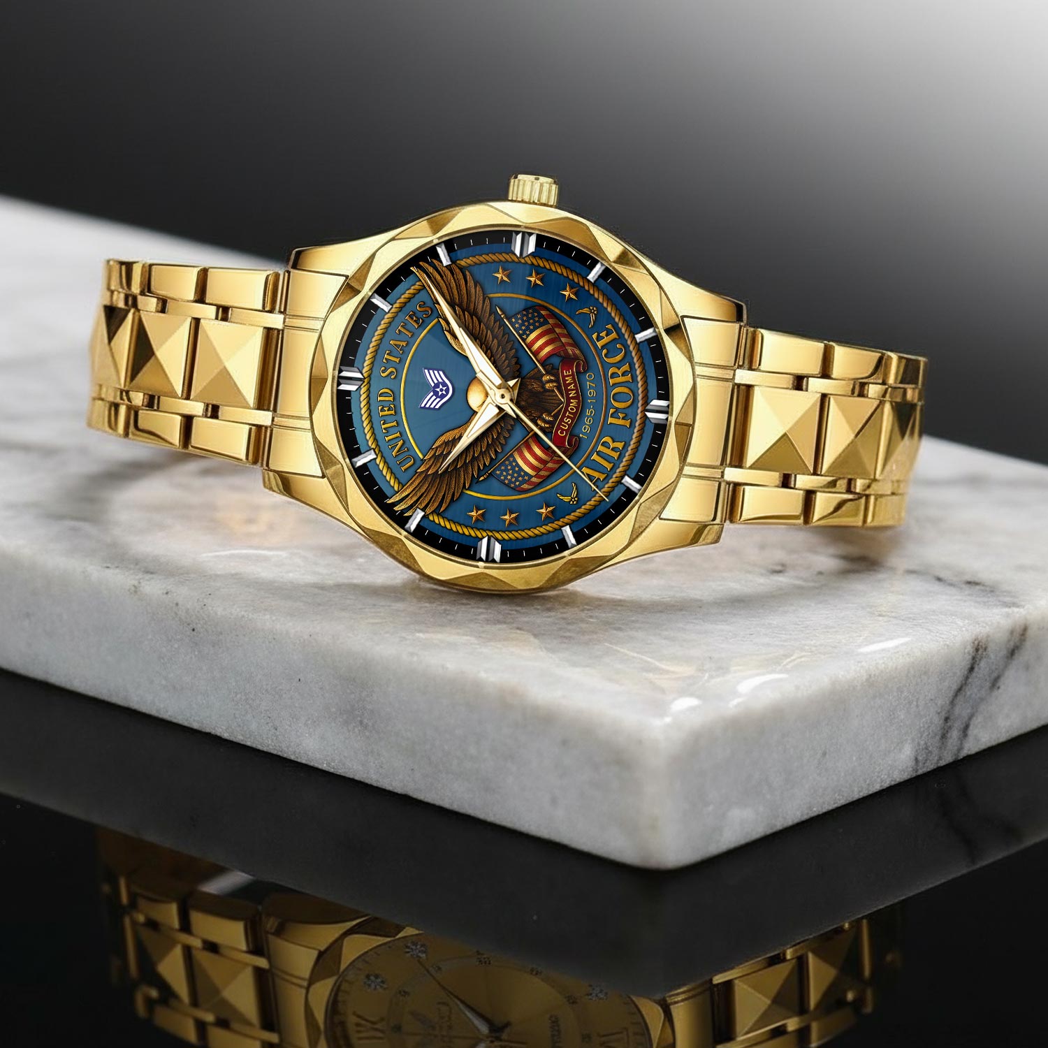 Customize your Diamond-Cut Bezel Watch with your name, rank, and years of service for a truly one-of-a-kind timepiece. This personalized feature allows you to showcase your military journey with pride and distinction.
