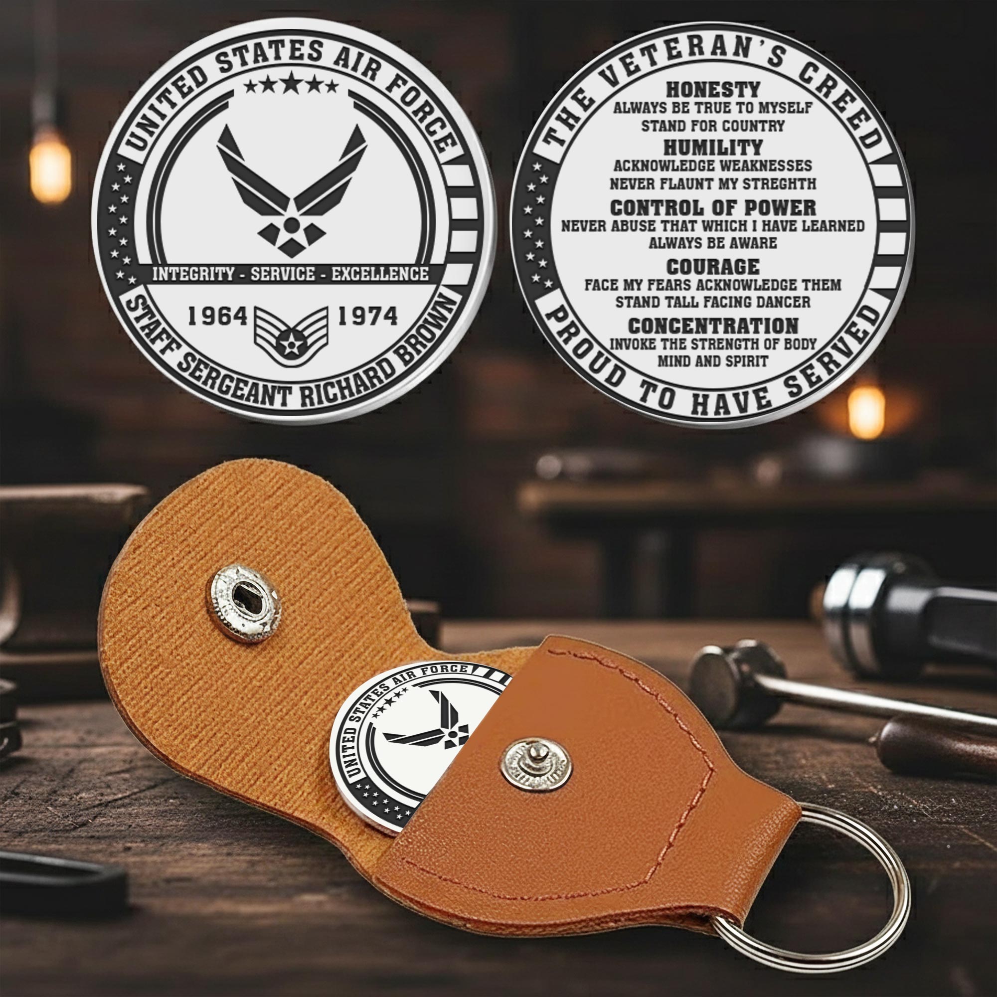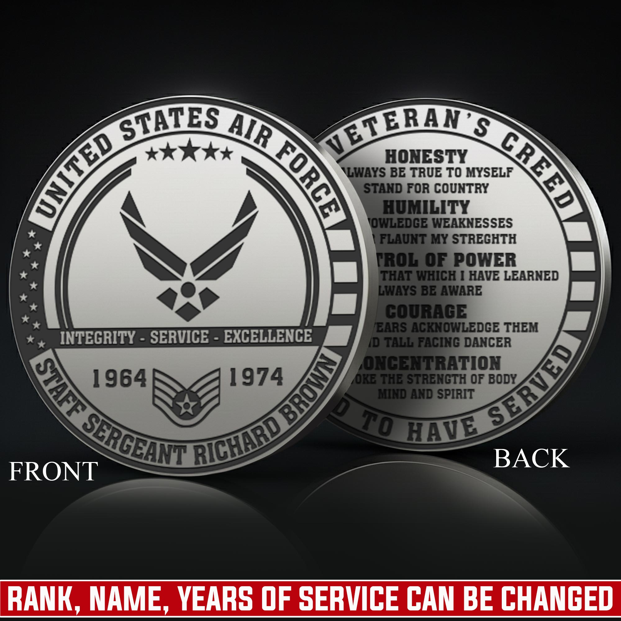 Add Your Personal Touches: you’re enabled to customize both sides of the coin with your name, rank, military branch, unit insignia, or service dates to create a personalized keepsake.