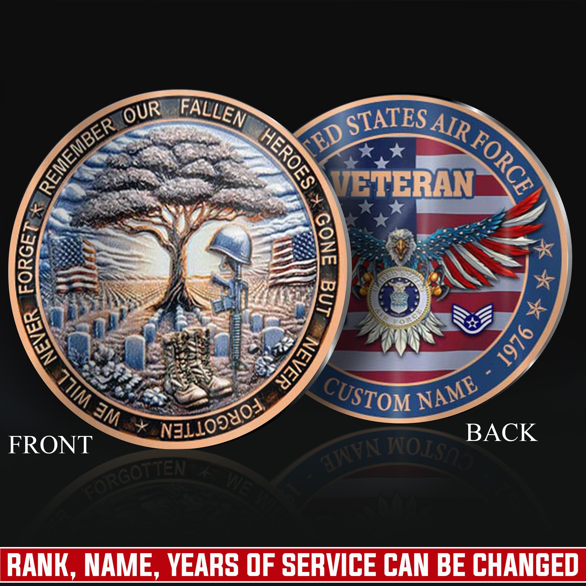 Honor Their Service: customize with veteran’s name, achieved rank, service branch, assigned unit, career specialty, or total years served on both coin faces.