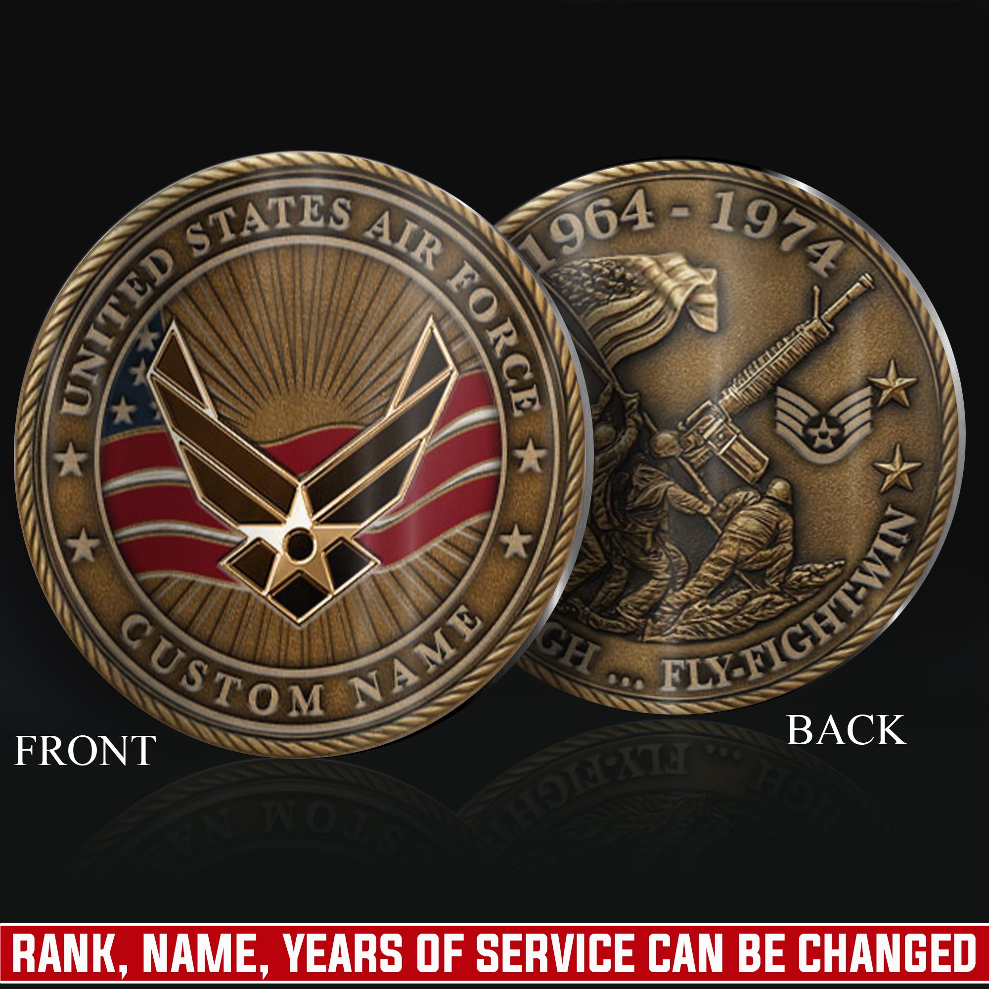 Personalize Your Coin: add custom printing including name, rank, military branch affiliation, unit number, specialty designation (MOS/rating), or deployment dates on both sides.