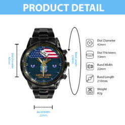 Personalize your Black Stainless Steel Watch with custom engravings of your name, rank, and years of service. This thoughtful addition transforms your watch into a cherished memento, honoring your dedication and commitment to service.