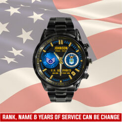 Make your Black Stainless Steel Watch uniquely yours by adding your custom information such as name, rank, and years of service. This personalized detail adds a special touch, celebrating your military journey with elegance and grace.