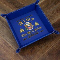 Featuring state-of-the-art UV printing technology, this valet tray promises permanent personalization that resists fading and peeling, with designs rendered in bold black that maintain their clarity indefinitely. The carefully selected vegan leather provides outstanding durability and texture while honoring cruelty-free values, and the corner-snap assembly system offers both stability during use and convenient collapsibility for storage. An essential organizational tool that honors military service while keeping everyday essentials like wallets, phones, and accessories beautifully arranged.
