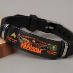 Incorporating an adaptive strap mechanism, the bracelet transcends traditional sizing limitations. It emerges as a profound tribute to veterans, symbolizing dedication, service, and the enduring spirit of patriotism.