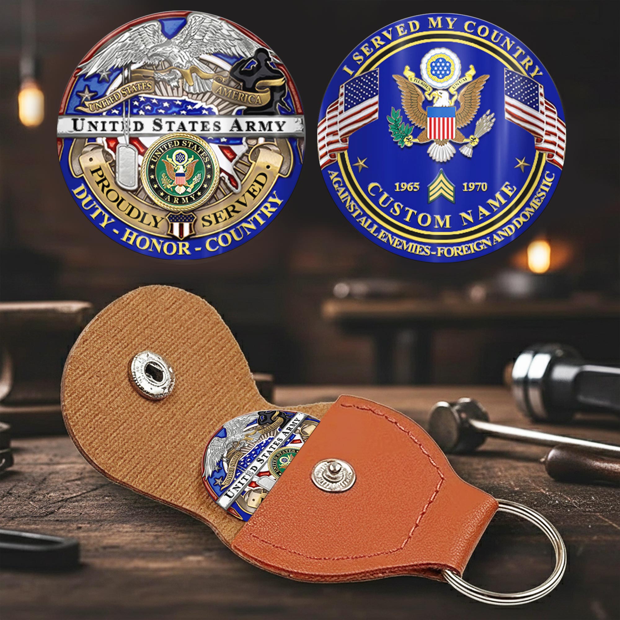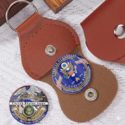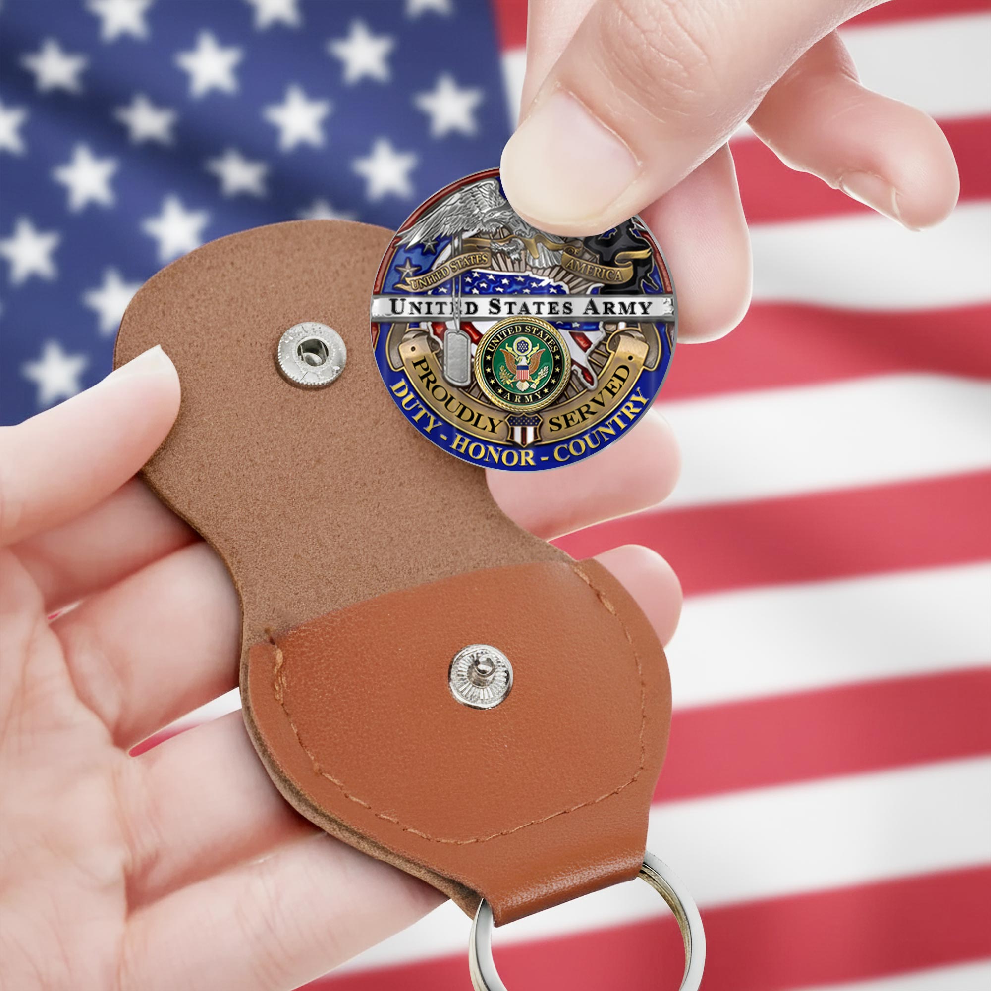 The Military Commemorative Challenge Coin showcases exceptional craftsmanship with detailed printings on both sides of solid stainless steel. Protected in a quality PU leather case with secure snap fastener, this coin honors military heritage and individual achievement.