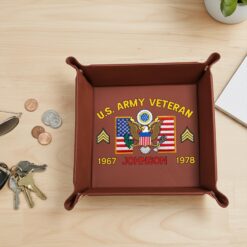 Designed with practicality in mind, this Veteran Personalized Leather Valet Tray features generous 7.5″ x 7.5″ outer dimensions and a 1.75″ profile that accommodates various items comfortably. The 6″ x 6″ personalization zone provides substantial space for custom veteran designs, complemented by decorative silver snaps positioned at each corner for structural integrity. Constructed entirely from high-quality durable vegan leather, this tray represents a perfect blend of sustainability and sophistication.