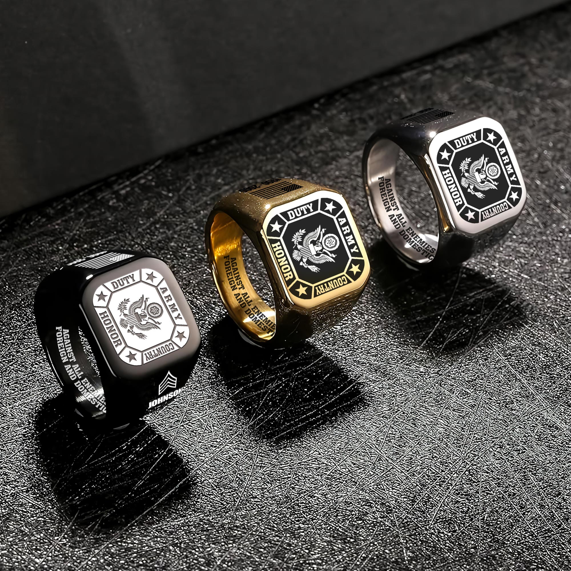 Presented in three elegant finishes – Silver, Gold, and Black – each offering distinct character and appeal. Beyond simple ornamentation, these rings honor military tradition, representing courage and commitment to service.