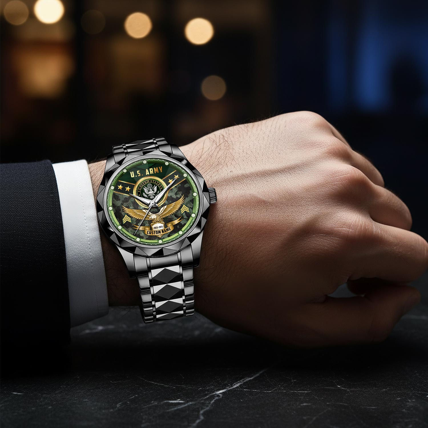 Make your Diamond-Cut Bezel Watch a reflection of your personal journey by including custom details like your name, rank, and years of service. This personalized feature not only adds a touch of elegance but also serves as a timeless tribute to your dedicated service to our country.