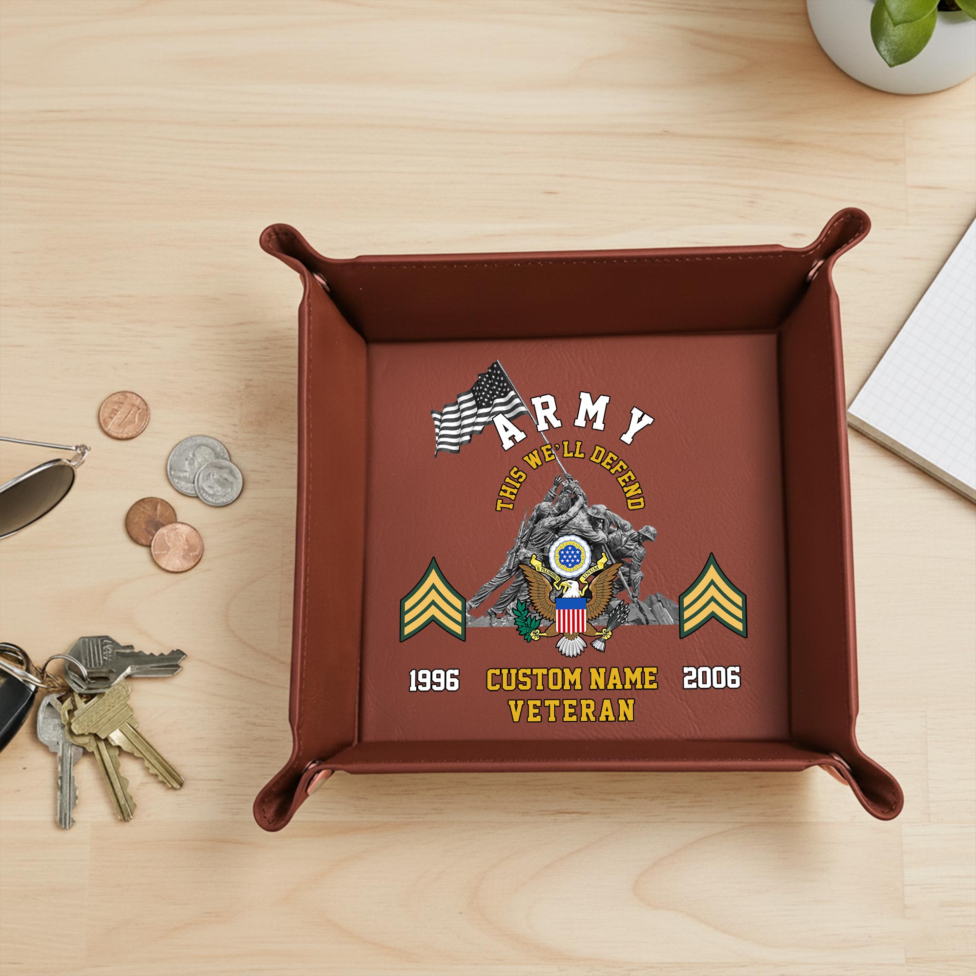 Utilizing advanced UV printing technology, this valet tray ensures your personalized veteran design remains vibrant and intact—never fading or peeling over time with the design beautifully engraved in black. The eco-friendly vegan leather construction delivers exceptional durability without compromising on style, while the collapsible design with corner snaps allows for easy storage when not in use. Perfect for displaying military pride while keeping keys, watches, coins, and other personal items neatly organized in one convenient location.