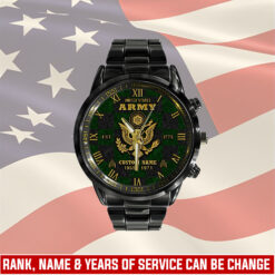 Customize your Black Stainless Steel Watch with your name, rank, and years of service for a truly one-of-a-kind timepiece. This personalized feature allows you to showcase your military journey with pride and distinction.