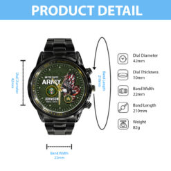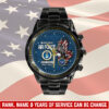 Elevate your Black Stainless Steel Watch with a personal touch by incorporating your custom details like name, rank, and years of service. This unique addition commemorates your military experience in a stylish and meaningful way.