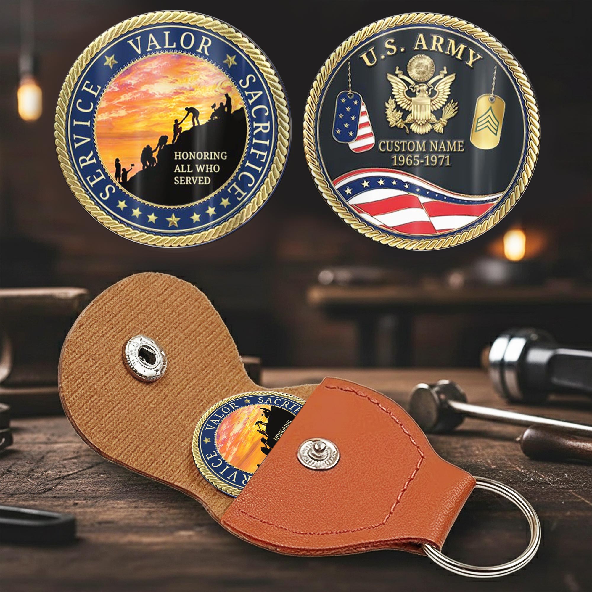 Honor the brave with the Personalized Military Challenge Coin, featuring double-sided custom printing on durable stainless steel. Complete with a premium PU leather protective case, this coin embodies the spirit of military tradition and honor.
