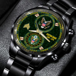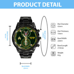 Make your Black Stainless Steel Watch uniquely yours by adding your custom information such as name, rank, and years of service. This personalized detail adds a special touch, celebrating your military journey with elegance and grace.