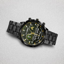 Personalize your Black Stainless Steel Watch with custom engravings of your name, rank, and years of service. This thoughtful addition transforms your watch into a cherished memento, honoring your dedication and commitment to service.