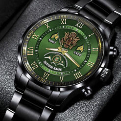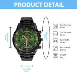Elevate your Black Stainless Steel Watch with a personal touch by incorporating your custom details like name, rank, and years of service. This unique addition commemorates your military experience in a stylish and meaningful way.