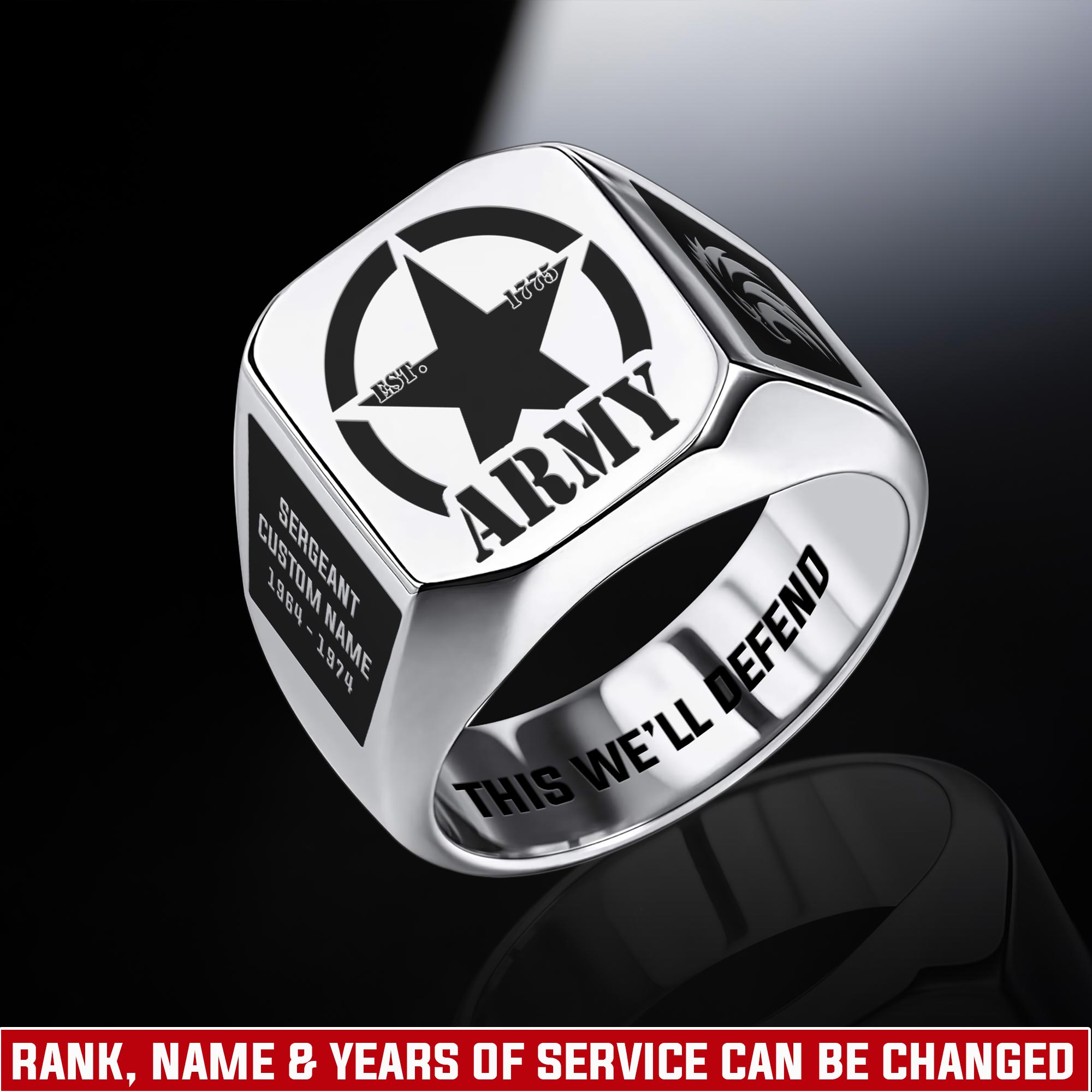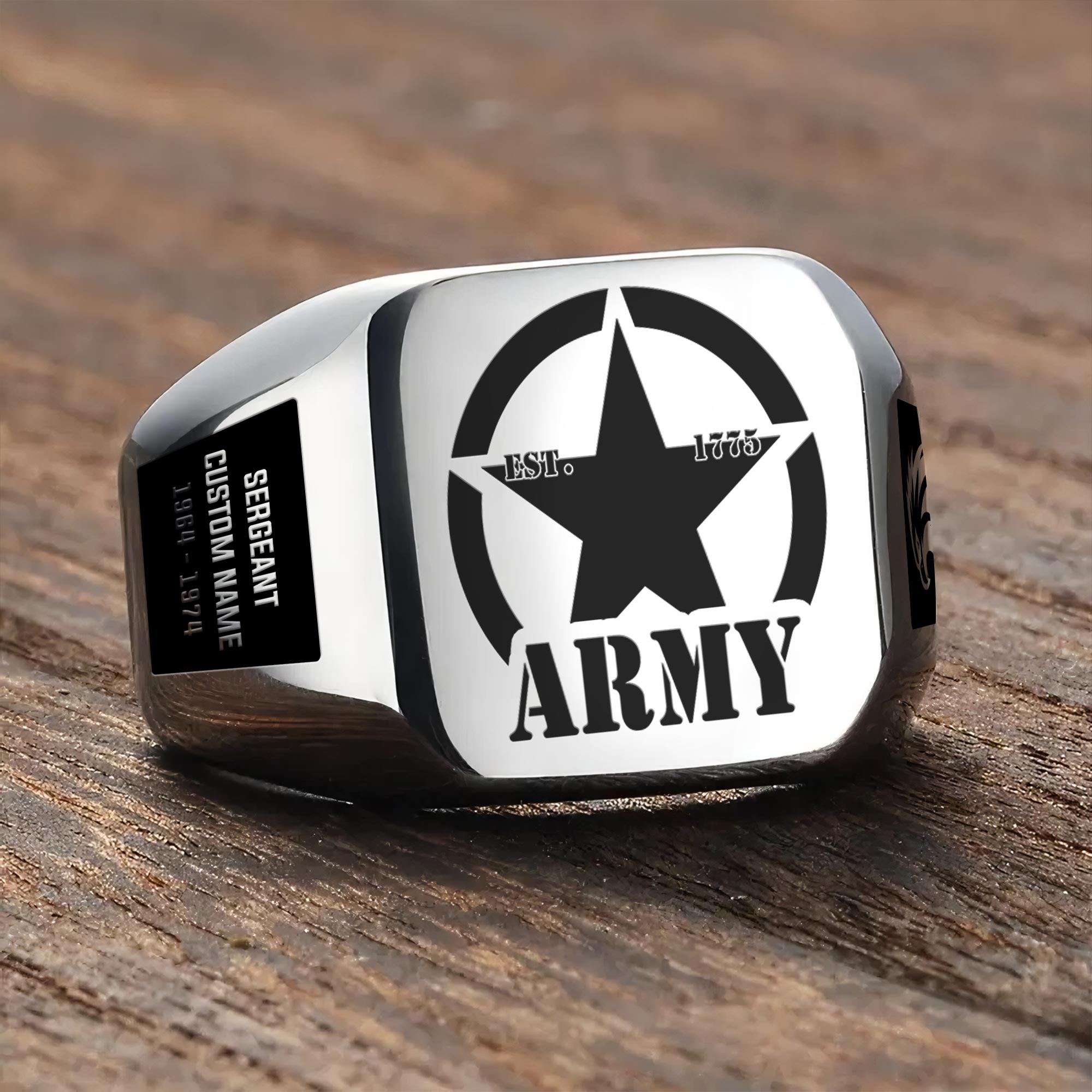 You’re enabled to customize your name, rank, rating, etc. to have them printed on the personalized engraved men’s ring. Create a unique piece that reflects your military journey and personal achievements.