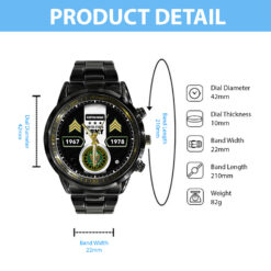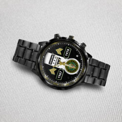 Personalize your Black Stainless Steel Watch with custom engravings of your name, rank, and years of service. This thoughtful addition transforms your watch into a cherished memento, honoring your dedication and commitment to service.