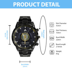 Customize your Black Stainless Steel Watch with your name, rank, and years of service for a truly one-of-a-kind timepiece. This personalized feature allows you to showcase your military journey with pride and distinction.