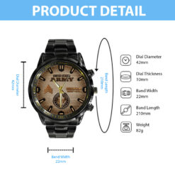 Customize your Black Stainless Steel Watch with your name, rank, and years of service for a truly one-of-a-kind timepiece. This personalized feature allows you to showcase your military journey with pride and distinction.