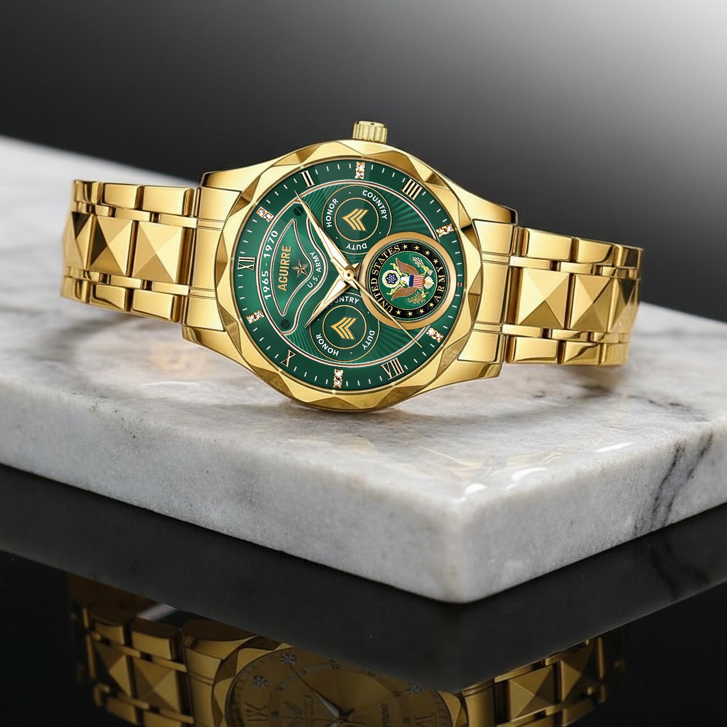 Personalize your Diamond-Cut Bezel Watch with custom engravings of your name, rank, and years of service. This thoughtful addition transforms your watch into a cherished memento, honoring your dedication and commitment to service.