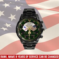 Elevate your Black Stainless Steel Watch with a personal touch by incorporating your custom details like name, rank, and years of service. This unique addition commemorates your military experience in a stylish and meaningful way.