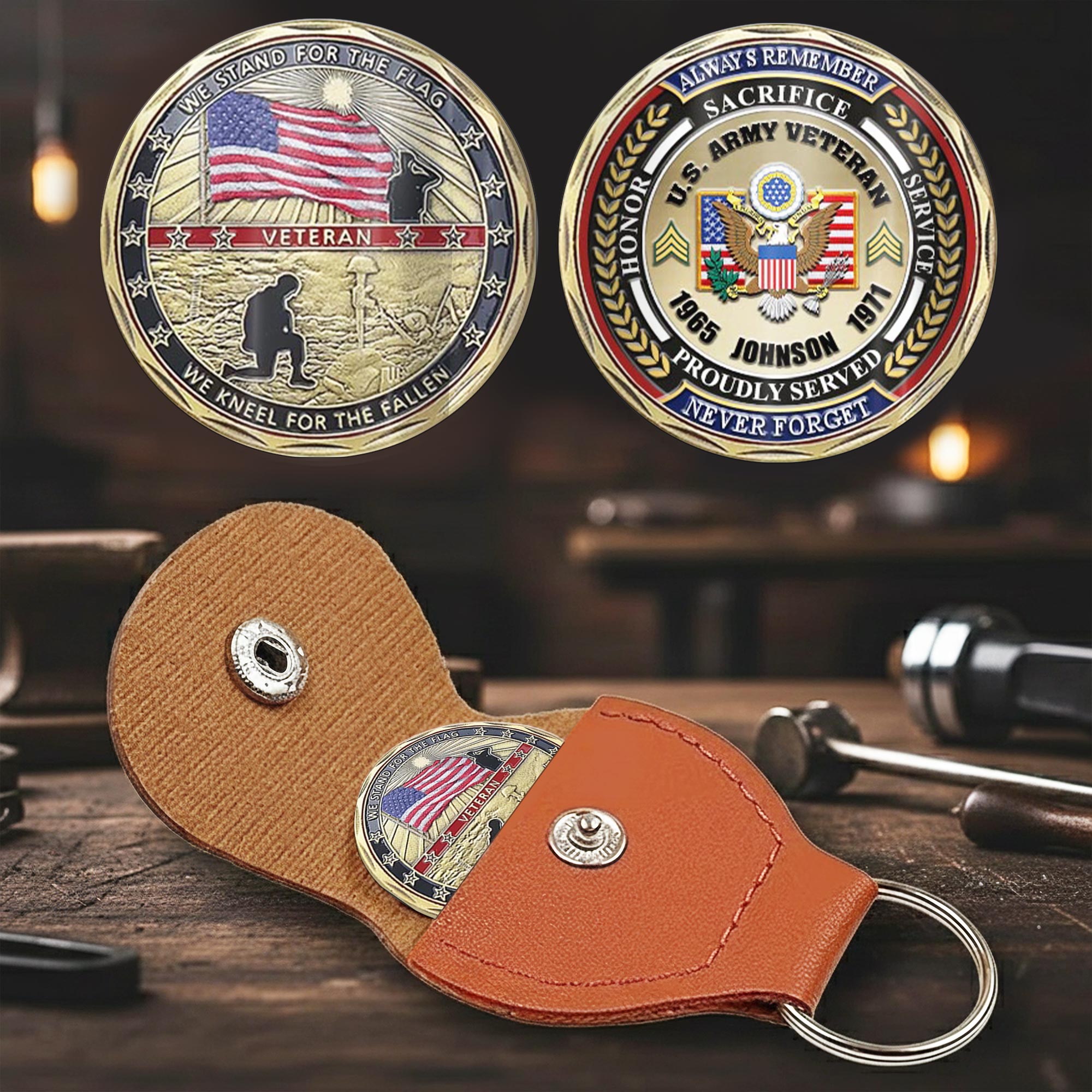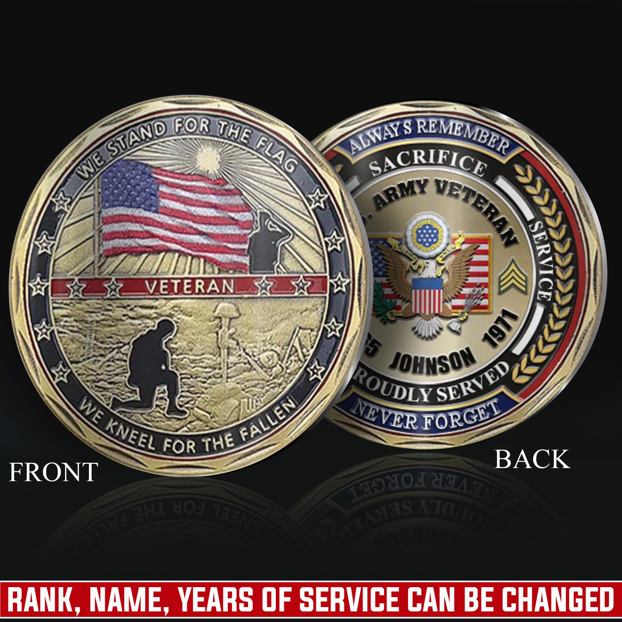 Personalize Your Coin: add custom printing including name, rank, military branch affiliation, unit number, specialty designation (MOS/rating), or deployment dates on both sides.