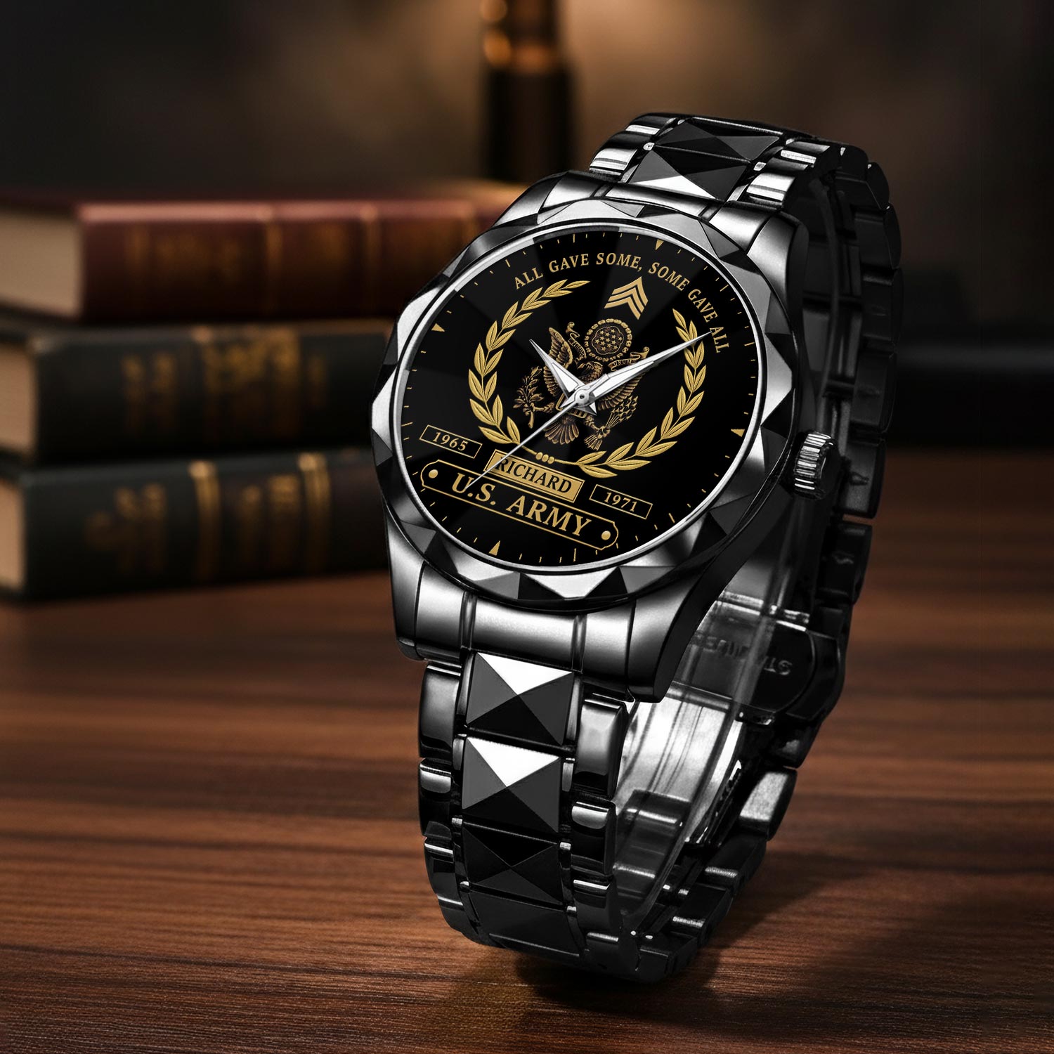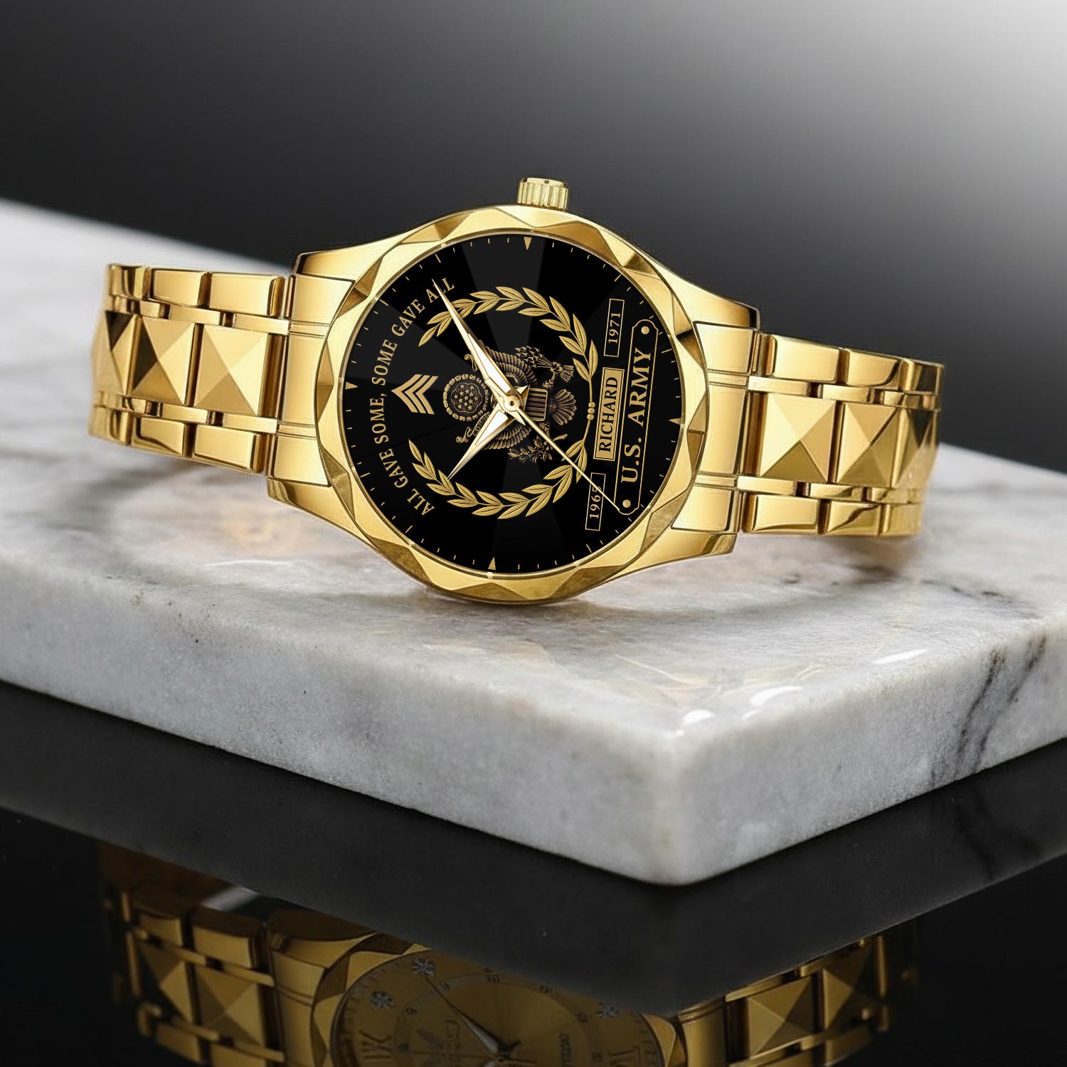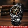 Customize your Diamond-Cut Bezel Watch with your name, rank, and years of service for a truly one-of-a-kind timepiece. This personalized feature allows you to showcase your military journey with pride and distinction.