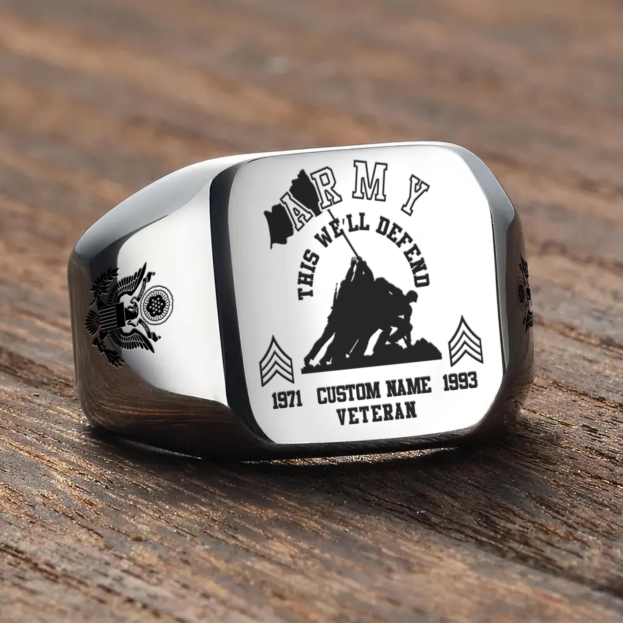 You’re enabled to customize your name, rank, rating, etc. to have them printed on the personalized engraved men’s ring. Make it uniquely yours by incorporating elements that celebrate your military identity and legacy.