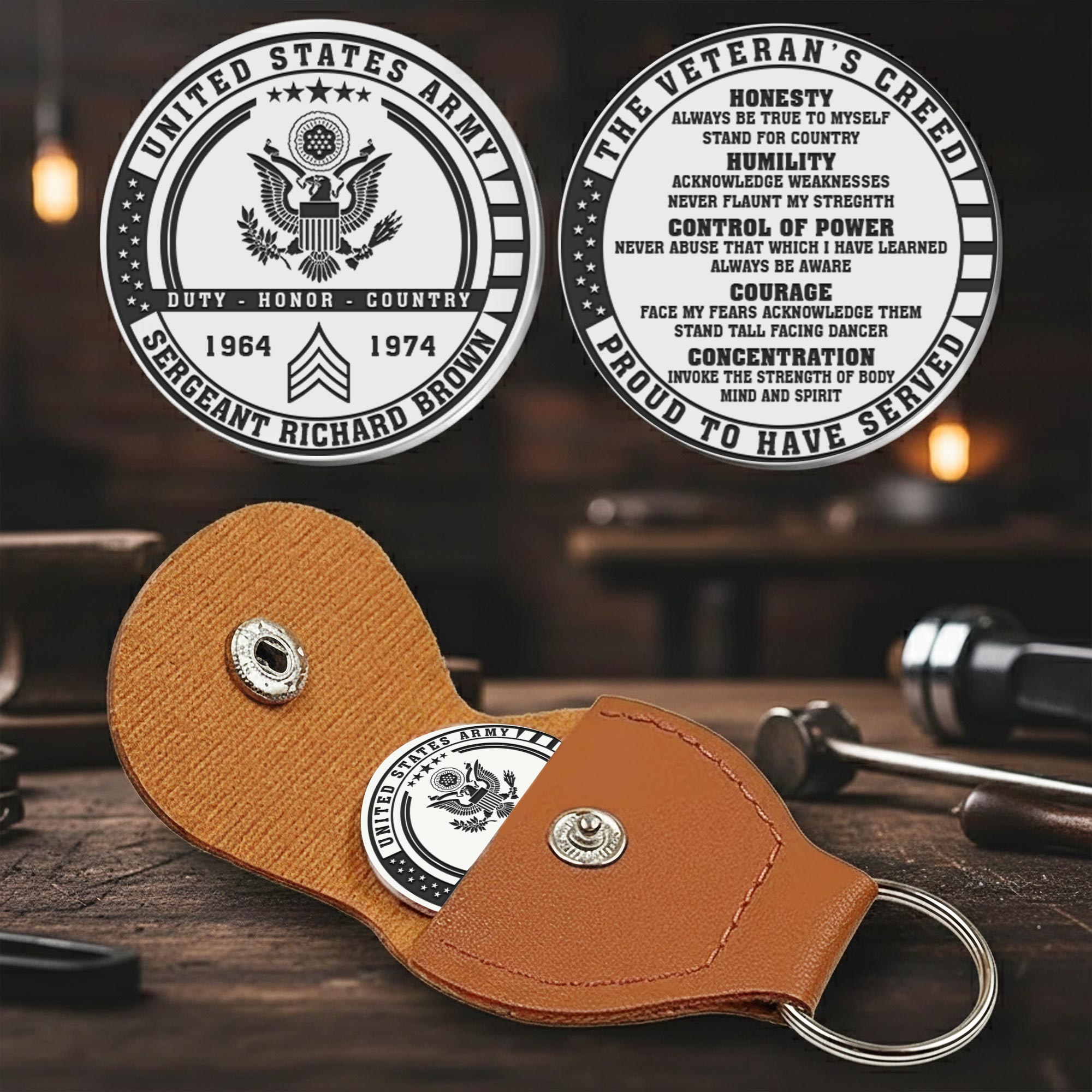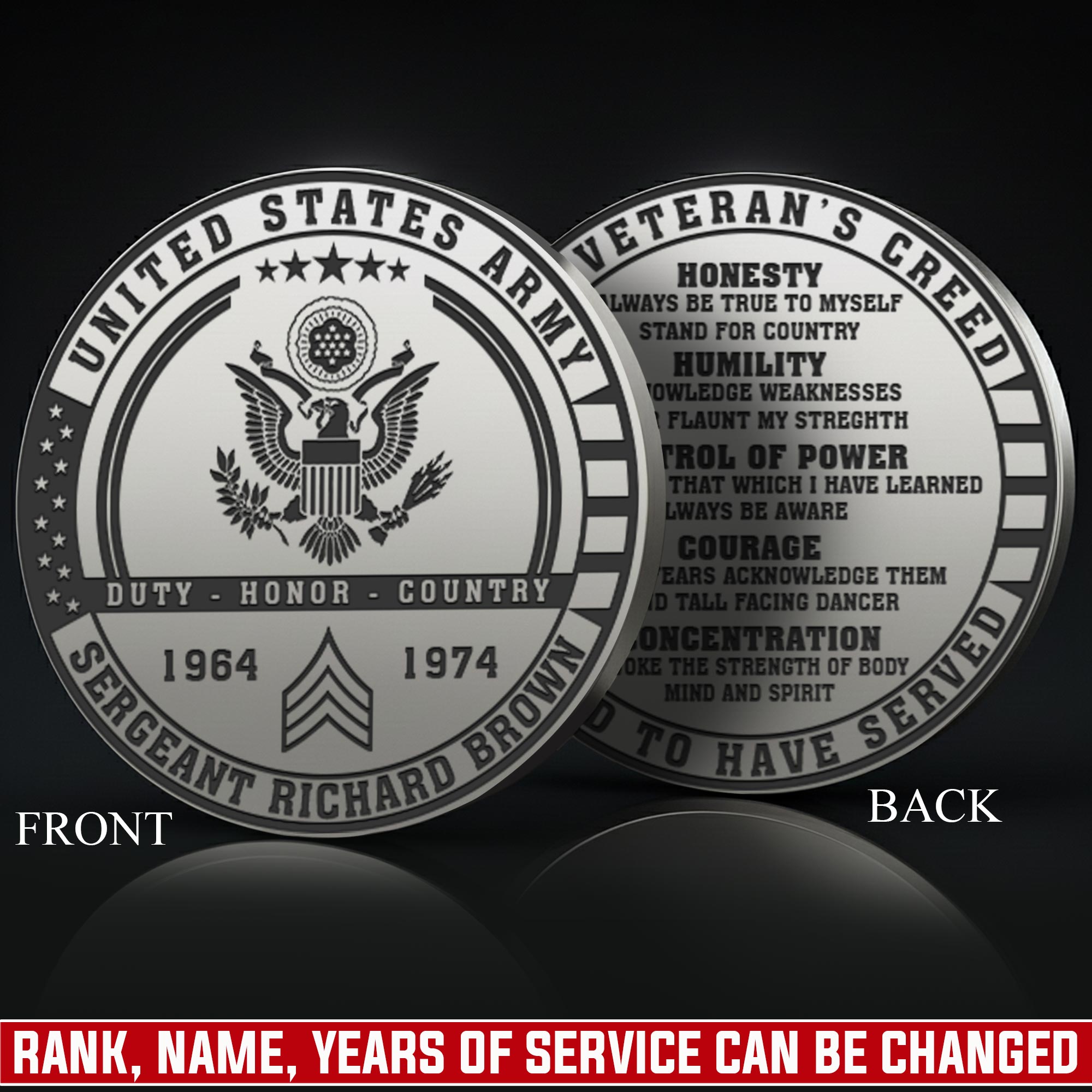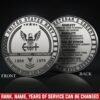 Honor Their Service: customize with veteran’s name, achieved rank, service branch, assigned unit, career specialty, or total years served on both coin faces.