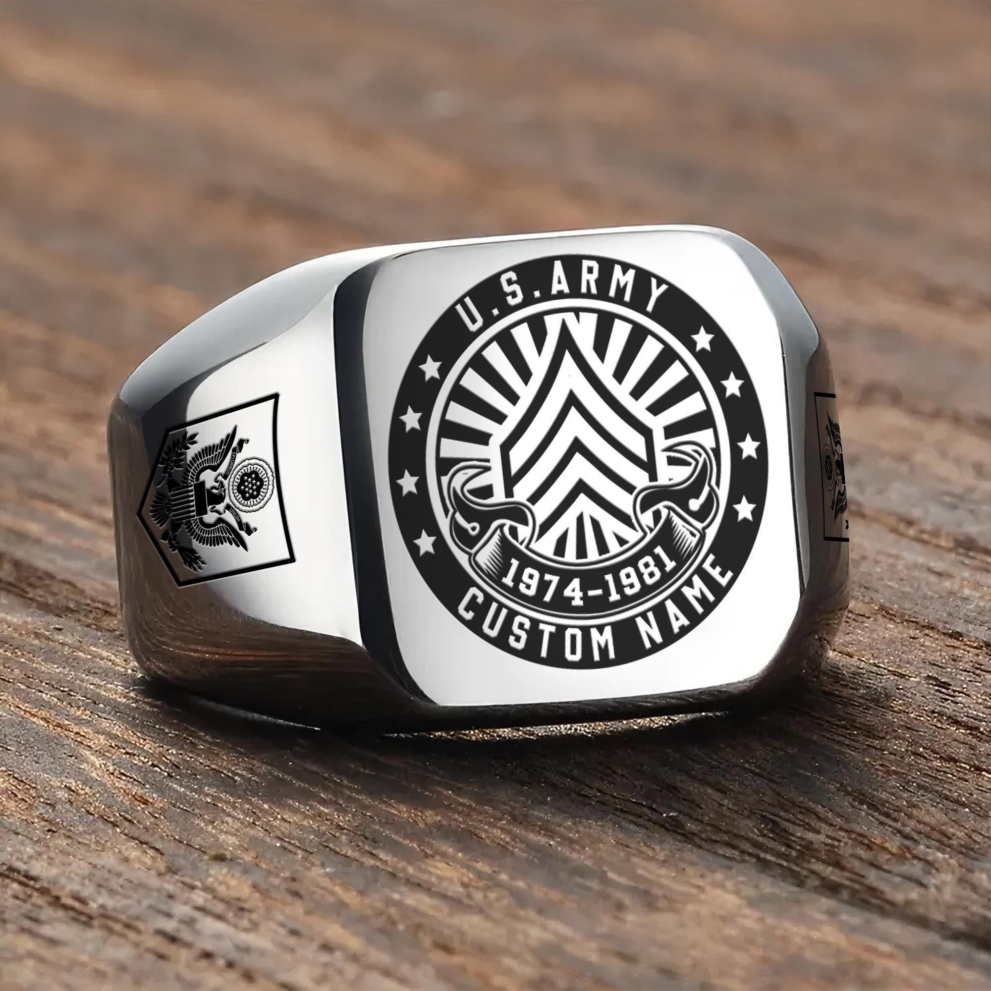 You’re enabled to customize your name, rank, rating, etc. to have them printed on the personalized engraved men’s ring. Make it uniquely yours by incorporating elements that celebrate your military identity and legacy.