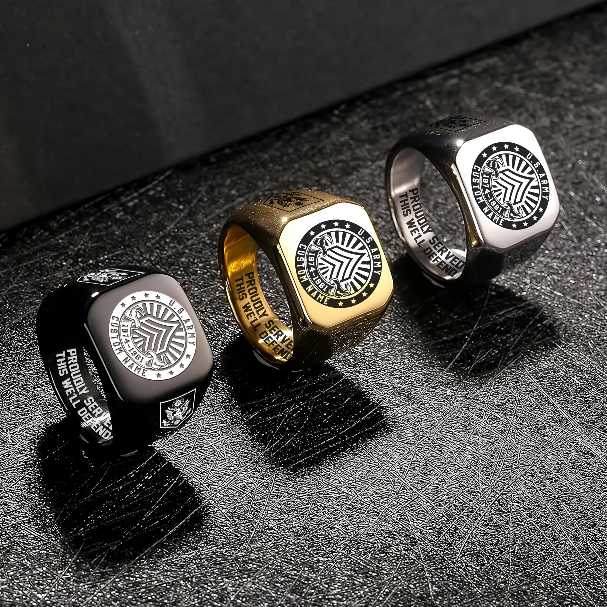 Choose from three sophisticated color variations – Silver, Gold, and Black – designed to complement any wardrobe. These rings stand as more than accessories, embodying the proud tradition of military service and sacrifice.