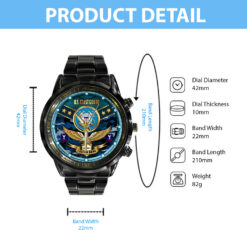 Personalize your Black Stainless Steel Watch with custom engravings of your name, rank, and years of service. This thoughtful addition transforms your watch into a cherished memento, honoring your dedication and commitment to service.