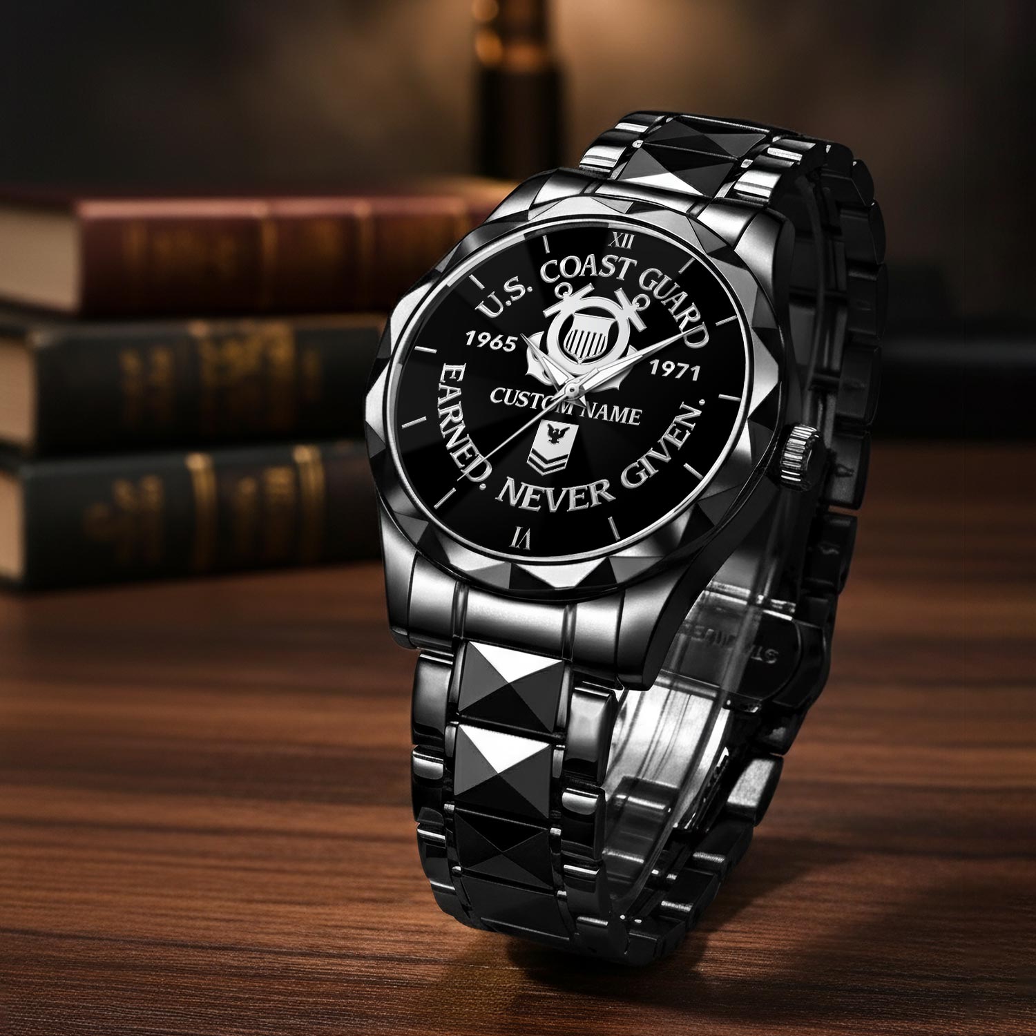 Customize your Diamond-Cut Bezel Watch with your name, rank, and years of service for a truly one-of-a-kind timepiece. This personalized feature allows you to showcase your military journey with pride and distinction.